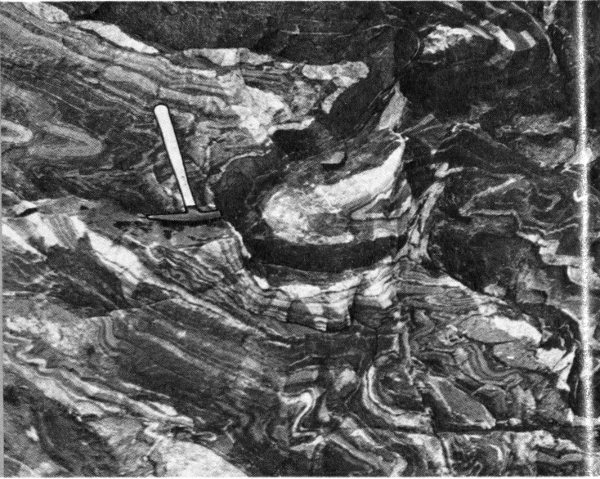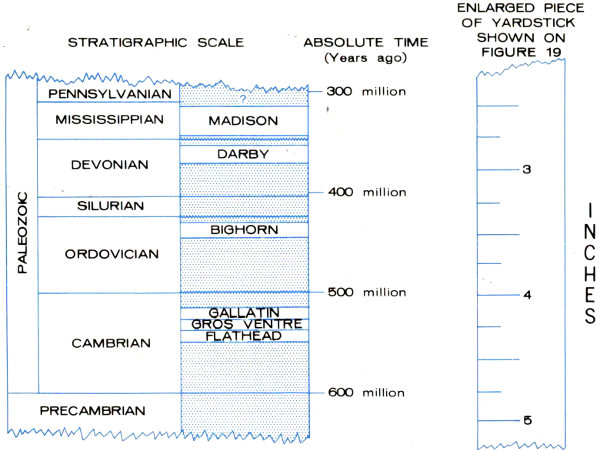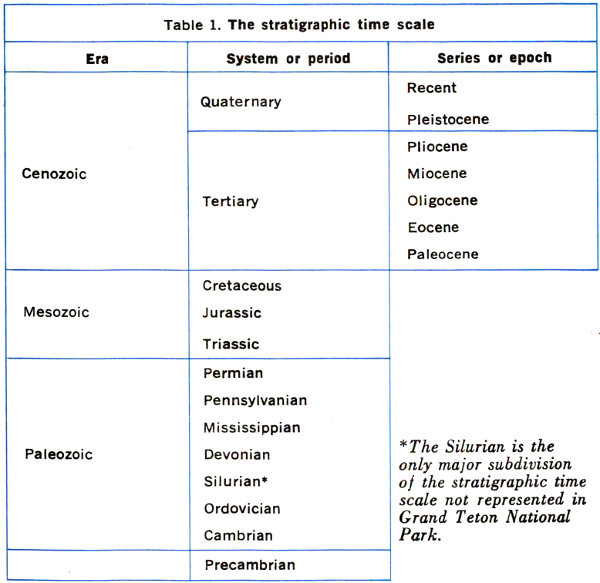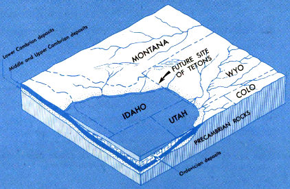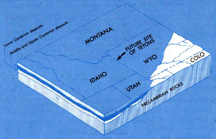 The more ambitious hiker or mountaineer can seek out the inner recesses of the range and explore other facets of its geology. He can visit the jewel-like mountain lakes—Solitude, Holly, and Amphitheater are just a few—cradled in high remote basins left by the Ice Age glaciers. He can 21 get a closeup view of the Teton Glacier above Amphitheater Lake, or explore the Schoolroom Glacier, the tiny ice body below Hurricane Pass. He may follow the trail into Garnet Canyon to see the crystals from which the canyon takes its name and to examine the soaring ribbonlike black dike near the end of the trail. In Alaska Basin he can study the gently tilted layers of sandstone, limestone, and shale that once blanketed the entire Teton Range and can search for the fossils that help determine their age and decipher their history. From Hurricane Pass he can see how these even layers of sedimentary rock have been broken and displaced and how the older harder rocks that form the highest Teton peaks have been raised far above them along the Buck Mountain fault.