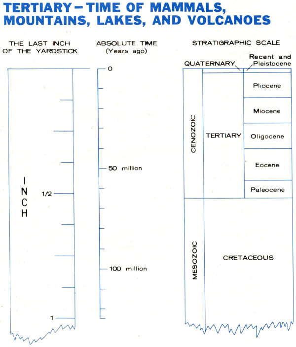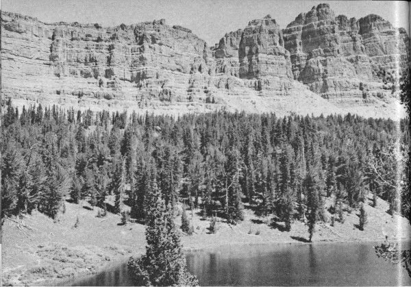 Visitors whose curiosity is whetted by this unusual and varied panorama are not satisfied with only a few questions and answers. They sense that here for the asking is an extraordinary geologic (geo—earth; logic—science) story. With a little direction, many subtle features become evident—features that otherwise might escape notice. Here, for example, is a valley with an odd U-shape. There is a sheer face crisscrossed with light- and dark-colored rocks. On the valley floor is a tuft of pine trees that seem to be confined to one particular kind of rock. On the rolling hills is a layer of peculiar white soil—the only soil in which coyote dens are common. All these are geologically controlled phenomena. In short, with a bit of initial guidance, the viewer gains an ability to observe and to understand so much that the panorama takes on new depth, vividness, and excitement. It changes from a flat, two-dimensional picture to a colorful multi-dimensional exhibit of the earth’s history.