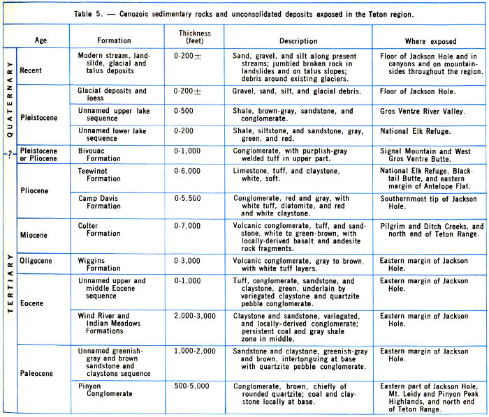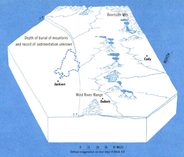 These concepts were developed to explain the origin of mountainous areas hundreds or thousands of miles long but they do not answer directly the question of why the Tetons rose and Jackson Hole sank. As is discussed in the chapter on mountains, it is probable that semifluid rock far below the surface of Jackson Hole flowed north into the Yellowstone Volcanic Plateau-Absaroka Range volcanic area, perhaps taking the place of the enormous amount of ash and lava blown out of volcanoes during the last 50 million years. The origin of the line of weakness that marks the Teton fault along the east face of the Teton Range may go back to some unknown inequality in the earth’s composition several billion years ago. Why it suddenly became active late in the earth’s history is an unanswered question.