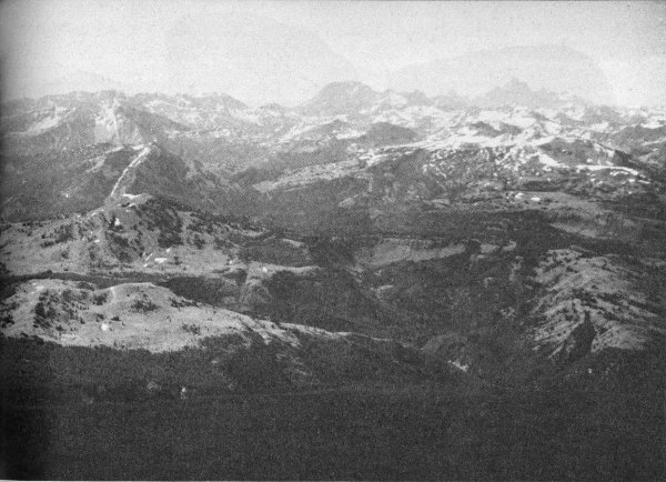 In the view north along the crest of the Teton Range, the asymmetry of the mountains is most apparent. The steep east face culminating in the highest peaks contrasts with the lower more gentle west flank of the uplift. From the Grand Teton it is not possible to see the actual place where the mountains disappear under the lavas of Yellowstone Park, but the heavily timbered broad gentle surface of the lava plain is visible beyond the peaks and extends across the entire north panorama. Still farther north, 75 to 100 miles away, rise the snowcapped peaks (from northwest to northeast) of the Madison, Gallatin, and Beartooth Mountains.