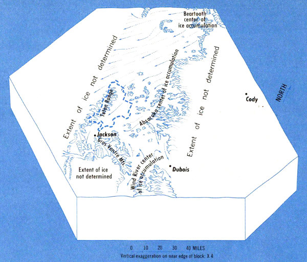 From this vantage point the mountaineer also gets a concept of the magnitude of the first and largest glaciers that scoured the landscape. Ice flowed southwestward in an essentially unbroken stream from the Beartooth Mountains, 100 miles away, westward from the Absaroka Range, and northwestward from the Wind River Range (fig. 57). Ice lapped up to treeline on the Teton Range and extended across Jackson Hole nearly to the top of the Lower Gros Ventre Slide. The Pinyon Peak and Mount Leidy Highlands were almost buried. All these glaciers came together in Jackson Hole and flowed south within the ever-narrowing Snake River Valley.