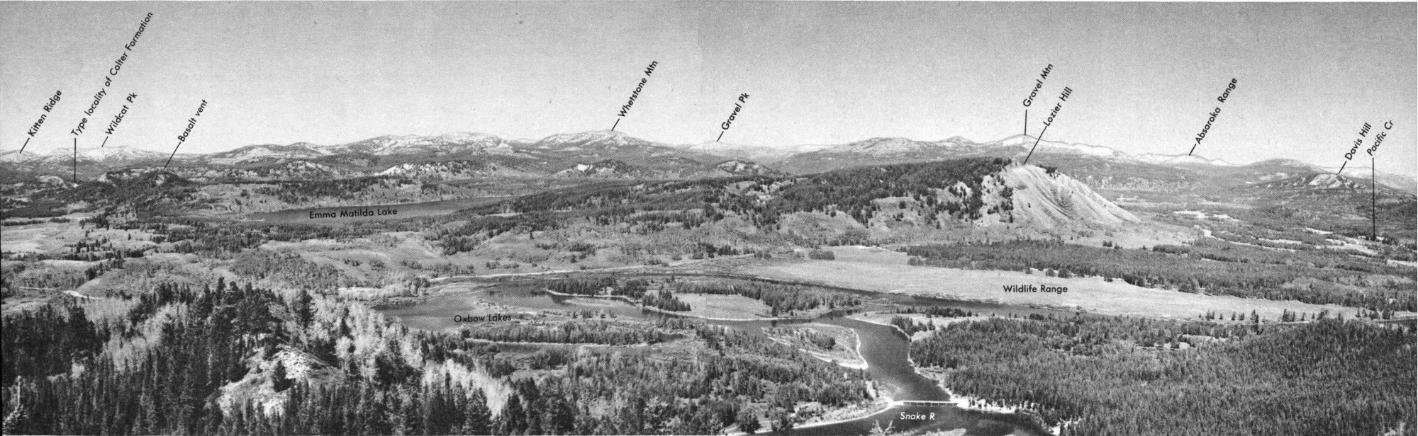 The view east presents the greatest contrasts in the shortest distances—the flat floor of Jackson Hole is 3 miles away and 7,000 feet below the top of the Grand Teton. Along the junction of the mountains and valley floor are blue glacial lakes strung out like irregular beads in a necklace. They are conspicuously rimmed by black-appearing margins of pine trees that grow only on the surrounding glacial moraines. Beyond these are the broad treeless boulder-strewn plains of Jackson Hole. Fifty miles to the east and northeast, on the horizon beyond the rolling hills of the Pinyon Peak Highlands, are the horizontally layered volcanic rocks of the Absaroka Range. Southeast is the colorful red, purple, green, and gray Gros Ventre River Valley, with the fresh giant scar of the Lower Gros Ventre Slide near its mouth. Bounding the south side of this valley are the peaks of the Gros Ventre Mountains, whose tilted slabby gray cliff-forming layers resemble (and are the same as) those on the west flank of the Teton Range. Seventy miles away, in the southeast distance, beyond the Gros 23 Ventre Mountains are the shining snowcapped peaks of the Wind River Range, the highest peak of which (Gannett Peak) is about 20 feet higher than the Grand Teton.