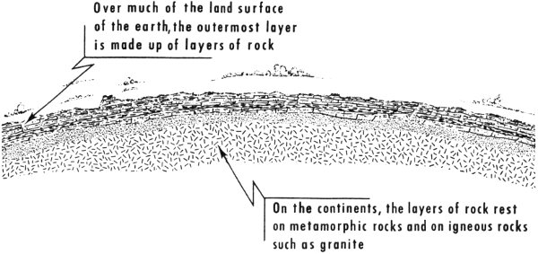 Rocks and minerals make up most of the outer layer or crust of our earth—the actual ground beneath our feet. The crust is approximately 18 to 30 miles thick beneath the continents. In general, the outermost part consists of many layers of stratified rocks, one above another. The older rocks normally make up the bottom or the deeper layers, and the younger rocks form the upper layers. Not all the layers are perfectly flat and parallel—some are lenticular (lens-shaped), some are tilted, some are partly eroded away, and some are present in one place and absent in another. Beneath the continents, the layers of rock rest on ancient metamorphic rocks and on great masses of igneous rock such as granite. These lower rocks are known as the basement.