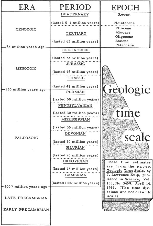 These time estimates are from the paper, Geologic Time Scale, by J. Lawrence Kulp, published in Science, Vol. 133, No. 3459, April 14, 1961. (The time divisions are not drawn to scale)