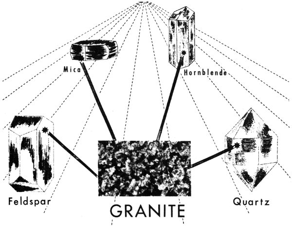 We have already compared the chemical elements to the alphabet and the minerals to words. We can now go a step further and compare rocks to sentences. We put words together to make sentences; nature puts minerals together to make rocks. A sentence does not have to be made up of a definite number of words, nor does a rock have to be made up of a definite number of minerals. Some rocks, such as granite, may be composed of several minerals. Others, such as dolomite and rock gypsum, consist of only one mineral.
