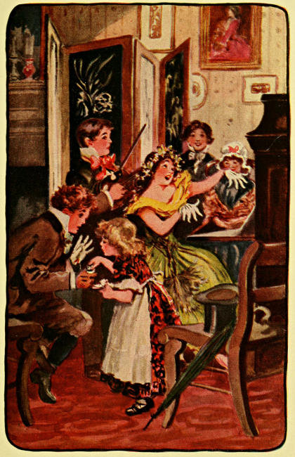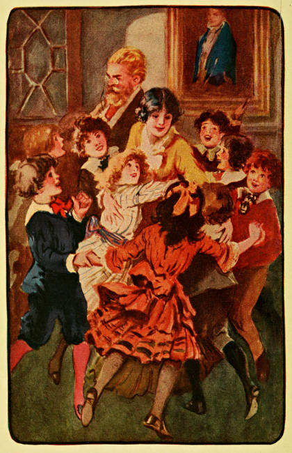 The Professor had joined them, and as Mr. March spoke he gave a hand to each, and left them with a look that was a blessing. As Jo and her husband stood together for a moment talking quietly, and feeling that their summer work had been well done if father approved, Mr. Laurie slipped into the hall, said a word to the children, and all of a sudden the whole flock pranced into the room, joined hands and danced about Father and Mother Bhaer, singing blithely—