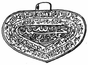 Many of these amulets have pierced ears for suspension, and they were worn as jewellery on the neck or ears or sewn on girdles. They were also fixed on weapons of war and horse furniture. Some of the stones are engraved in reverse so as to make impressions. These are seal stones, but the greater number are engraved simply so as to read[5] straightforwardly. They are in Arabic, Persian, and rarely Turkish.
