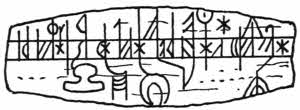 Mankind is naturally imitative, and among his early efforts in this direction are the scratchings on bones and antlers. They comprise outlines of deer, mammoths, reindeer,[2] seals, bears, horses and other animals. Several instances of these early drawings have been found in the caves of the Dordogne in France. These, however, are not records, they are only pictures of what the artist saw, and a large proportion of rock and stone markings come into the same category. But there is no doubt that many of the latter are intended to commemorate certain events; they show groupings of marks, animals and men in positions and attitudes which are clearly intended to mean something, and now and then it has been possible to make a good guess at their interpretation.