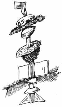 Such symbolical messages are common enough among savage tribes, but without some key it is almost impossible to interpret them. They are so various in their composition that no useful analysis of them can be made. On one such message from West Africa, strung on a string of flat fibre knotted at each end, are a bit of shell, a bit of fur, a bean, a cylindrical stick, a piece of leather, a mass of frog’s eggs or something like it, a flat piece of bark, a feather, a tooth and a shell. In another are two pieces of flat glass kept together with red thread, and two teeth on each side of it, all strung on fibre, and so on.