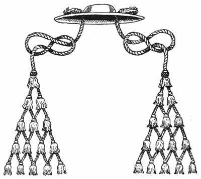 The tassels start from one, and from this two others depend, and from these three, and so on, one more in each row. An abbot wears a black hat with six green tassels on each side; a bishop wears a green hat with six green tassels on each side on a gold cord; an archbishop has a violet hat with ten violet tassels on each side on a gold cord, and a cardinal has a red hat with fifteen red tassels on a gold cord, depending on each side.