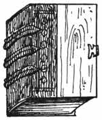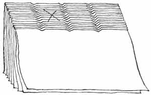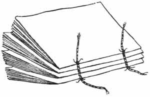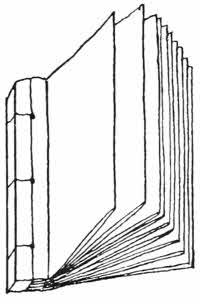 A common form of book in Oriental countries consists of long narrow strips of palm leaf, kept together by two strings run through holes near each end. The writing upon the leaves is carried right along the length of each leaf in successive lines, and is scratched in, and usually strengthened by means of lamp black rubbed over it so as to stick in the scratches.