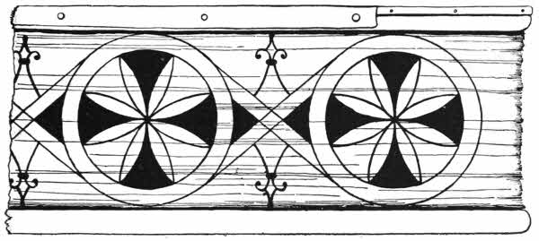 English clog almanacks are squared pieces of wood, measuring from about two feet to nine or ten inches in length, and the larger ones are sometimes as much as three inches square. They are notched along the angles, small notches without ornamentation indicating week days, big notches stand for Sundays, and Saints days have all kinds of ornamental flourishes, which now and then show familiar forms such as Saint Catherine’s wheel and Saint Lawrence’s gridiron.