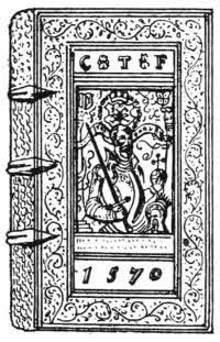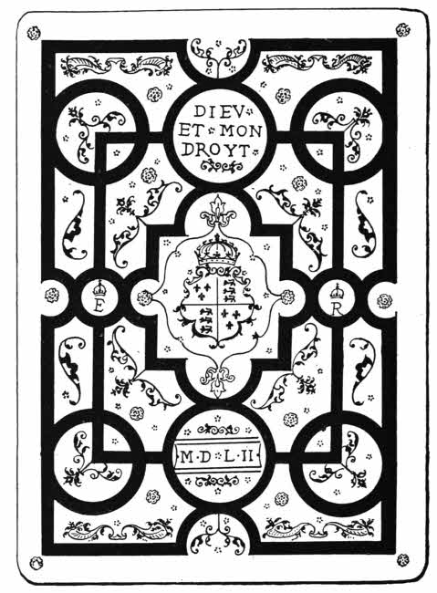 The most gorgeous period of French bookbinding was that of Henri II. and his children. Henri himself loved fine bindings, and so did Catherine de Medici, but unfortunately we do not know who executed them. They are in calf or morocco, and nearly always have coloured fillets. Those which were bound for Diane de Poictiers, Duchesse de Valentinois,[234] are equally remarkable, and all of them have, as a rule, heraldic ornamentation. A fine portrait cameo stamp, however, of Henri II. appears as a centrepiece on some of his bindings, and the name Dianne appears on one of Diane’s now in the Bibliothèque Nationale at Paris.
