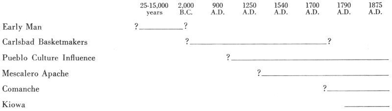Next to enter our area were the Apaches from the north after 1300 A.D.(?) Whether they exerted pressure on the Basketmakers we do not know. After the Apaches acquired horses from the Spanish, thus making them mobile, different groups moved to other parts of New Mexico and Arizona. Branching to the south and southeast were the Mescalero and Lipan bands. The Mescalero band settled in an area which included the Guadalupe Mountains and surrounding districts whence they raided the Pueblo Indians and the Spanish until about 1725, when another Plains group, the Comanches, came into the country from the northeast. By pushing the Apaches north and west, the Comanches controlled a tremendous portion of the Southern Plains.
