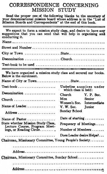 CORRESPONDENCE CONCERNING MISSION STUDY Send the proper one of the following blanks to the secretary of your denominational mission board whose address is in the “List of Mission Boards and Correspondents” at the end of this book. ================================================================= We expect to form a mission study class, and desire to have any suggestions that you can send that will help in organizing and conducting it. Name ............................................................ Street and Number ............................................... City or Town ..................... State ........................ Denomination ..................... Church ....................... Text-book to be used ............................................ ================================================================= We have organized a mission study class and secured our books. Below is the enrolment. Name of City or Town .................... State ................. Text-book ......................... Underline auspices under which class is held: Denomination ...................... Church Y. P. Soc. Church ............................ Men Senior Women’s Soc. Intermediate Name of Leader .................... Y. W. Soc. Junior Sunday School Address ........................... Name of Pastor .................... Date of starting ............ State whether Mission Study Class, Frequency of Meetings ....... Lecture Course, Program Meetings, or Reading Circle ............... Number of Members ........... ................................. Does Leader desire Helps? ... Chairman, Missionary Committee, Young People’s Society ........... ............................................................ Address .................................................... Chairman, Missionary Committee, Sunday School .................... ............................................................ Address ....................................................