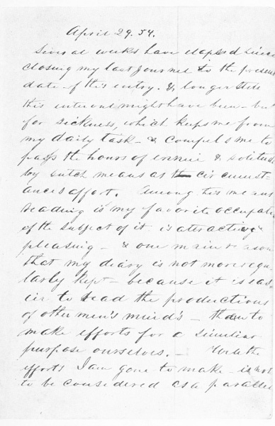 Several weeks have elapsed since closing my last journal to the present date of this entry, and longer still this interval might have been but for sickness, which keeps me from my daily task and compels me to pass the hours of ennui and solitude by such means as circumstances afford. Among these means, reading is my favorite occupation if the subject of it is attractive and pleasing and one main reason that my diary is not more regularly kept is because it is easier to read the productions of others' minds than to make efforts for a similar purpose ourselves. The efforts I am going to make are not to be compared to the writing of fictitious works, nor still less scientific essays but are simply to note down the most important occurrences of my career—a few abrupt ideas of my own and other men and some remarks upon the political and moral affairs of the world.