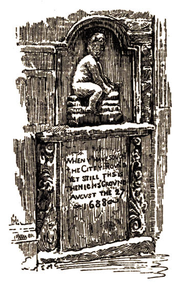 To the observing eye, however, traces of a former state of things are still to be seen, not only in important buildings such as the City halls, the parish churches and the old merchants’ houses still existing; but in objects less conspicuous, for instance, the sculptured house and street signs which came into fashion after the Great Fire. These have no little artistic merit, and almost all are interesting from their associations. The greater part of my book is devoted to a careful description of such signs; not only the existing ones, but all of which I can find any mention. This description I have tried to make as complete as possible, and I have allowed myself some latitude, recording not only facts which appeared to me of interest concerning the particular house, court, or alley to which the sign belonged, but also its probable origin, and any story or legend that might be connected with it.