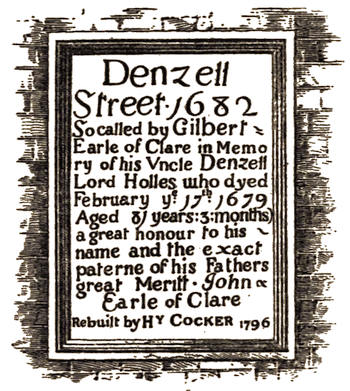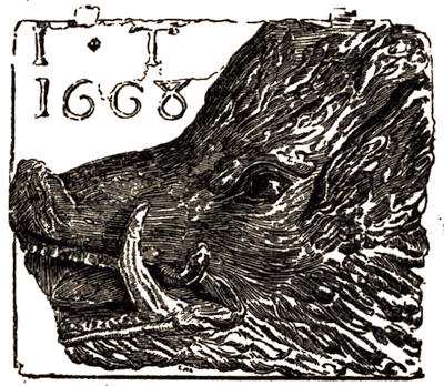 Sculptured signs are often heraldic, and from them the transition is natural to still existing crests and coats of arms carved on buildings in various parts of the town. A cognate subject is[xiii] that of old dates and inscriptions, suggestive as they are of the former ownership of property, of changes in the names of streets, sometimes even giving us glimpses of family history; as in the inscription to Denzil Lord Holles.