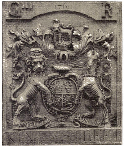 Painted signs, which were once almost universal, were suddenly cleared away by the Act of Parliament of 1762, but these sculptured signs remained because they were a part of the houses to which they were attached, and they only pass away when the houses are rebuilt.