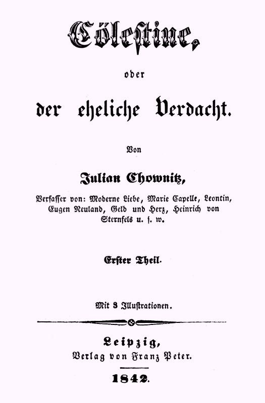 The Project Gutenberg EBook of Cölestine, oder der eheliche Verdacht; Erster Theil (von 2), by Julian Chownitz This eBook is for the use of anyone anywhere in the United States and most other parts of the world at no cost and with almost no restrictions whatsoever. You may copy it, give it away or re-use it under the terms of the Project Gutenberg License included with this eBook or online at www.gutenberg.org. If you are not located in the United States, you'll have to check the laws of the country where you are located before using this ebook. Title: Cölestine, oder der eheliche Verdacht; Erster Theil (von 2) Author: Julian Chownitz Release Date: October 5, 2016 [EBook #53217] Language: German Character set encoding: UTF-8 *** START OF THIS PROJECT GUTENBERG EBOOK COELESTINE, ERSTER THEIL *** Produced by the Online Distributed Proofreading Team at http://www.pgdp.net (This file was produced from images generously made available by The Internet Archive)