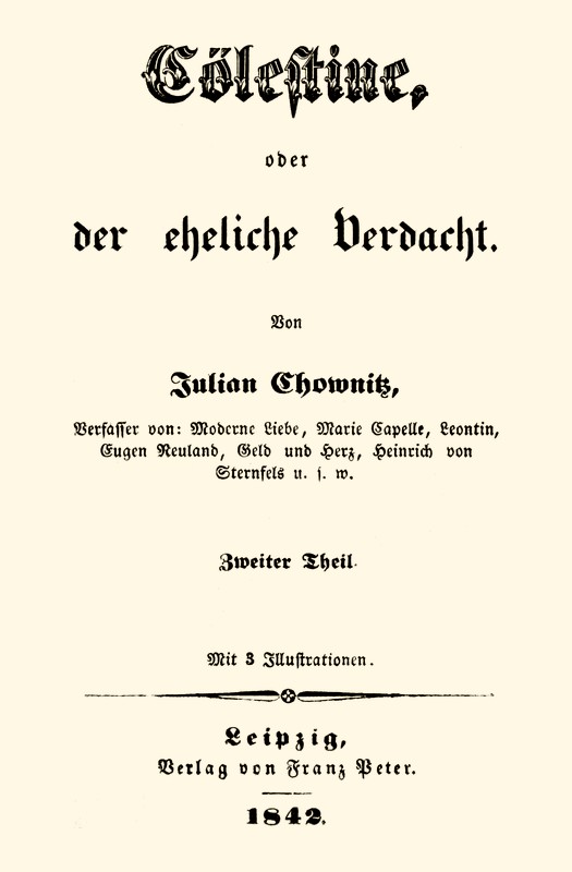 Nicht weit von hier, an die Wand gerückt, steht ein Sopha, welches ebenfalls aussieht, als hätte man darauf z. B. getanzt. Hier liegt ein zweites Individuum im tiefsten Schlaf versunken, was durch zeitweises kräftiges Schnarchen hinlänglich bestätigt wird... auch dieses Individuum ward gestern vom Genius der Nüchternheit nicht begleitet — und was seine Gestalt betrifft, so war sie uns schon einigemal vorgekommen. Jedoch ist hier weder der edle Venusritter von Althing — noch etwa gar (das Gegentheil wäre indeß nicht so ganz unmöglich) der tapfere Graf von Wollheim gemeint.... an Herrn von Marsan ist nicht zu denken. — Eine ganz andere Person tritt hier vor unsere Erinnerung und wir fühlen uns hierbei zu den Anfangspunkten gegenwärtiger Geschichte versetzt. Kurz: der Baron von Leuben, jener bleiche, schwärmerische, wilde Jüngling, den die Vermählung Cölestinens so unglücklich gemacht hatte — steht, oder vielmehr liegt hier vor uns. — Wie aber ist er[S. 6] hierher gekommen? wie in diesen Zustand, der nicht sein gewöhnlicher war, gerathen? — welche innige Verbindung herrscht zwischen ihm und Edmund, da ihre Bekanntschaft in früherer Zeit doch eine ganz alltägliche, wie sie unter allen jüngern Leuten eines Standes herrscht, war? — — Geduld, alle diese Fragen sollen früher oder später beantwortet werden. Man sieht es, daß auch dieser Mensch stark betrunken ist; indeß hat sein Zustand bei ihm keine so eclatanten Symptome hervorgebracht — — entweder ist seine Natur kräftiger, wie jene Edmunds (was aber nicht scheint) — oder — —[A]