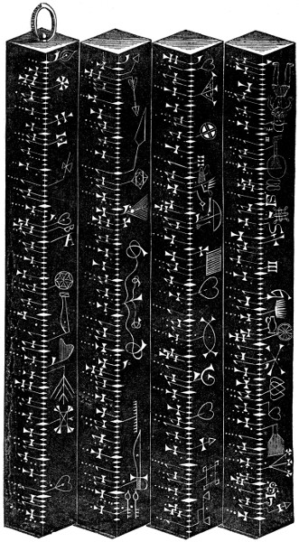 Of the word “clog,” there is no satisfactory etymology in the sense here used, which signifies an almanack made upon a square stick. Dr. Robert Plot, who published the “History of Staffordshire,” in 1686, instances a variety of these old almanacks then in use in that county. Some he calls “public,” because they were of a large size, and commonly hung at one end of the mantle-tree of the chimney; others he calls “private,” because they were smaller, and carried in the pocket. For the better understanding of the figures on these clogs, he caused a family clog “to be represented in plano, each angle of the square stick, with the moiety of each of the flat sides belonging to it, being expressed apart.” From this clog, so represented in Dr. Plot’s history, the engraving is taken which forms the frontispiece now, on his authority, about to be described.