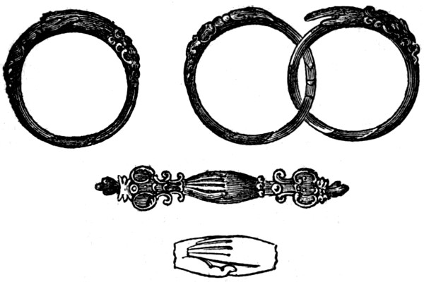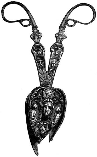 Table books, or tablets, of wood, existed before the time of Homer, and among the Jews before the Christian æra. The table books of the Romans were nearly like ours, which will be described presently; except that the leaves, which were two, three, or more in number, were of wood surfaced with wax. They wrote on them with a style, one end of which was pointed for that purpose, and the other end rounded or flattened, for effacing or scraping out. Styles were made of nearly all the metals, as well as of bone and ivory; they were differently formed, and resembled ornamented skewers; the common style was iron. More anciently, the leaves of the table book were without wax, and marks were made by the iron style on the bare wood. The Anglo-Saxon style was very handsome. Dr. Pegge was of opinion that the well-known jewel of Alfred, preserved in the Ashmolean museum at Oxford, was the head of the style sent by that king with Gregory’s Pastoral to Athelney.[2]