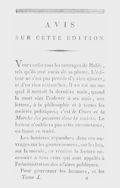 Voici enfin tous les ouvrages de Mably, tels qu’ils sont sortis de sa plume. L’éditeur ne s’est pas permis d’y rien ajouter, ni d’en rien retrancher. Il en est un auquel il mettoit la dernière main, quand la mort vint l’enlever à ses amis, aux lettres, à la philosophie et à toutes les sociétés politiques; c’est le Cours et la Marche des passions dans la société. Le lecteur n’oubliera pas cette circonstance, en lisant ce traité.