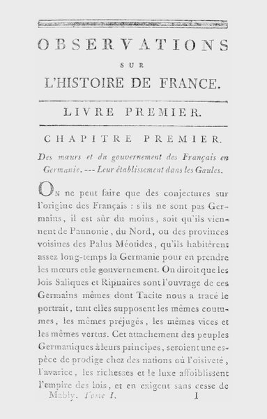 La première est le tableau que l’auteur nous trace d’une république des Francs, qui, quoiqu’on en ait dit, n’est nullement imaginaire. On y voit la liberté sortir avec eux des forêts de la Germanie, et venir arracher les Gaules à l’oppression et au joug des Romains. Clovis n’est que le général et le premier magistrat du peuple libérateur; et c’est sur une constitution libre et républicaine, que Mably place, pour ainsi dire, le berceau de la monarchie. Cette découverte anime d’un intérêt, jusqu’alors inconnu, ces premiers temps si obscurs et si dédaignés. C’est un jet de lumière qui colore ce vaste horizon, autrefois perdu dans les ténèbres, et dont la chaleur va fertiliser toutes ces landes de notre ancienne histoire.