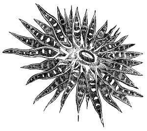 Thyone papillosa, one species of Sea-Cucumber, has ten branches to this set of organs, which it seldom displays when in captivity; but a little gentle motion artificially imparted to the water, as suggested in another place, would probably produce the kind of excitement requisite for their expansion, as the introduction of fresh water to the tank seldom fails to produce this effect for a time. When irritated, these creatures have the capacity of committing self-destruction in a most determined and complete manner, 90by expectorating the whole of the intestines and leaving their case or shell bare and empty. But Sir J. Dalzell has observed that the shell thus deprived of its living inmate, must be much more intimately connected with its life and organization than the shells of the Molluscs; for after a considerable lapse of time, he observed that the rejected parts have been renewed by gradual growth. The introduction of a single drop of fresh water will at once drive the creature to this summary mode of putting an end to the inconvenience.