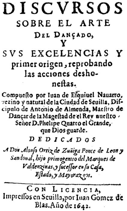 Por comission del señor Dõ Miguel de Luna y Arellano, Cauallero del abito de Santiago, del Consejo de su Magestad, y su Oydor en la Real Audiẽcia de esta Ciudad, he visto los Discursos sobre el arte de Dançar, sus excelencias y primer origen, q̃ pretende imprimir Juan de Esquiuel Nauarro; y no hallo en ellos cosa contra nuestra santa fè, ni digna de reparo, sino antes muy buenos documentos para los que quisieren aprender reglas curiosas y modos politicos para los Maestros; y se manifiesta la destreza del Autor, y la afición al exercicio en el trabajo que ha puesto. Y assi por esto y no resultar daño a la Republica, como por la elecciõ en la Dedicatoria a persona de sangre tã ilustre, que admitirá la oferta, aunque pequeña, atendiendo a la voluntad y animo de Iuan de Esquiuel, que como dixo Seneca, haze grande lo pequeño, y decente lo no tal, merece que se le conceda la licencia q̃ pide para dar la obra a la estapa, siendo seruido el señor Don Miguel. Assi lo siento. En Seuilla a tres de Enero de mil y seisciẽtós y quarenta y dos años.