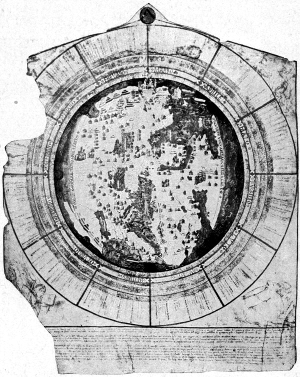 Vignettes of castles, walled towns, and churches stand for cities, kingdoms, and regions. In most cases the names have been written upon the vignettes themselves; since the latter are also colored pink or green, the letters are frequently obscured and quite illegible. Many towns and districts are shown by red dots beside which the names are written in ink, once black but now faded with age. These names were inserted after the vignettes were drawn, for in many instances they are tilted or compressed 6 to fit the available space. The draftsman did not venture to write any name to the left of the dot to which it belongs; as he could not write on the blue of the seas, he was obliged to invert the map in the case of places on south-facing coasts. Names of islands and seas, which had to be written on water surfaces, are inclosed in small yellow panels. The names of the continents, the two inscriptions relating to the polar and equatorial deserts, and the words “Terrestrial Paradise” are in red capitals; but all other names are in minuscule, usually without an initial capital. Besides place names there are a few longer legends.