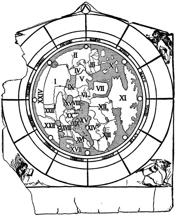 It should be noted first that east is at the top of the map and Jerusalem at the center; hence the long 5 axis of the Mediterranean runs vertically up the southern half of the disk.
