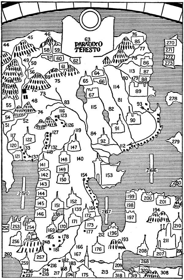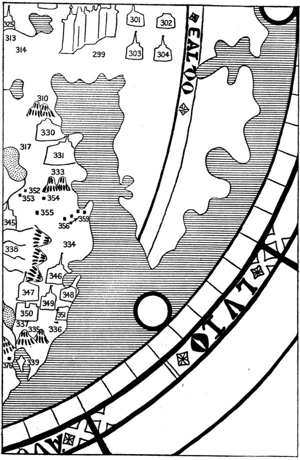 South of the sepulcher we see the River Volga (6, 7) flowing into the northwestern corner of the Caspian (250). A branch from the east (8), perhaps the Kama, joins the Volga where the latter bends at a right angle to the south. East of the lower Volga is a “desert of thirty days” (10), Polo’s mysterious demon-haunted desert of Lop, where the traveler hears ringing bells and other uncanny sounds (possibly “singing sands”). Like the Grand Khan’s tomb, this desert is also wofully misplaced, since the actual desert of Lop lies in eastern Chinese Turkestan. The responsibility is not Leardo’s, however, for the Lop desert is in the same place on the Catalan Atlas of 1375 and on the Este map.