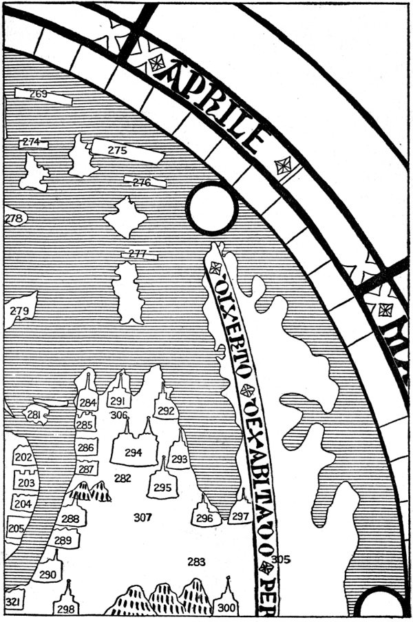 At a very early period the Greeks developed the idea (borrowed, perhaps, from the Babylonians[16]) that the earth is a flat disk surrounded by the Ocean Stream. This conception seems to have given rise to a cartographic tradition followed by certain ancient and medieval map-makers who had long outgrown the belief that the earth is actually flat. Thus Leardo draws a circular land mass, or oikoumene, surrounded by a narrow hem of water. We cannot, however, question his belief in the sphericity of the earth, for otherwise he could hardly have held the views expressed in the panel below the calendar. Furthermore, his two legends relating to the fiery and frozen deserts echo a theory that was propounded in classical times and based on the hypothesis of a spherical earth. This theory, worked out in detail by Crates of Mallos, is briefly as follows.[17] Around the equatorial circumference of the globe is a fiery zone so intensely hot that no man can cross it. This zone cuts off all communication with the southern hemisphere. The north and south polar caps are uninhabitable because of the cold. An ocean encircling the globe from north to south intercepts communication with the half of the northern hemisphere opposite the oikoumene. Many maps were made in the Middle Ages to illustrate this conception. Leardo presumably had it in mind 8 and did not intend to represent either a flat disk or a complete hemisphere but merely a circular portion of the earth’s surface lying north of the equator.
