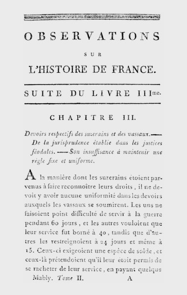[225] On a dû remarquer dans mon ouvrage que le gouvernement féodal avoit fait disparoître tous les sentimens d’honneur, de patriotisme et de bien public que les Français devoient aux lois de Charlemagne. On ne servit plus à la guerre son suzerain, que parce qu’on étoit censé payé par le fief qu’on tenoit de lui. C’est pour cela que tout, jusqu’aux dons et aux pensions qu’on donnoit à un gentilhomme, fut regardé comme un fief; voyez le second chapitre du troisième livre. C’est cette avidité mercenaire qu’il falloit détruire pour former un bon gouvernement; 573 mais elle étoit chère à un prince qui n’aimoit que le pouvoir arbitraire.
