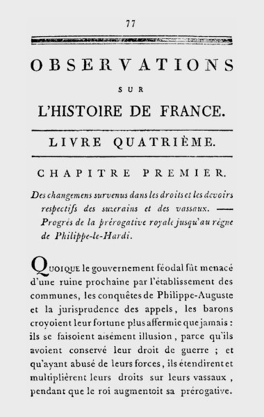 | Chap. I. Des changemens survenus dans les droits et les devoirs respectifs des suzerains et des vassaux. Progrès de la prérogative royale jusqu’au règne de Philippe-le-Hardi. | 77 |