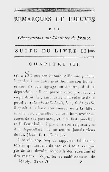 D’ailleurs, il falloit que les Français ouvrissent enfin les yeux sur la jurisprudence du duel judiciaire; car l’absurdité en étoit extrême, et les tribunaux ecclésiastiques leur offroient le modèle d’une procédure toute différente et beaucoup plus sage, quoiqu’encore très-vicieuse. Ils étoient donc toujours à la veille d’une révolution 39 à cet égard; et à juger de l’avenir par le passé, qui oseroit répondre que la réforme qui devoit se borner à changer la procédure des justices des seigneurs, et leur manière de juger, n’en détruiroit pas la souveraineté même?