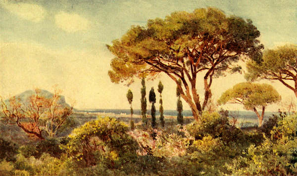I suppose it is because we are very simple folk, and lead at home a rather primitive life, that we find everything new which most other people find familiar, and so many things attractive that the bulk of the world treat as undeserving of attention. Along that magical coast, where we turned our gaze first to the sea-fringe, then to the hill declivities, then back again to the white-laced bays, and never being able to determine which were the more beautiful, I observe that persons who have travelled many hundreds of miles in order to enjoy the sunshine and glamour of the South, are well content to make this entrancing journey in a railway carriage, pulling down the blinds if the sun be a trifle too hot, and conning their newspaper or turning over the leaves of some conventional novel, in any case. That was not our way of travelling, which was a good deal more leisurely and more old-fashioned. We should have liked to find ourselves behind Veronica’s ponies, but our hired vehicle did well enough; and, while we never asked our cheerfully communicative driver to quicken his pace, we frequently begged him to slacken it, and over and6 over again bade him halt altogether. Although, save to Lamia, the road was no new one, we all alike had fresh unsophisticated eyes for it, and all of us found it a veritable wonder-world. Indeed, I could not help reflecting that we behaved very much as we behave at home in the garden that we love, declaring that the last blue creek, or the last secular olive-grove, was the most wonderful we had yet seen, for no better reason than that it was the last.