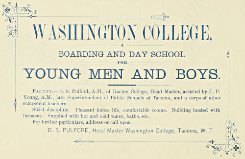 Faculty.—D. S. Pulford, A.M., of Racine College, Head Master, assisted by E. P. Young, A.M., late Superintendent of Public Schools of Tacoma, and a corps of other competent teachers.
