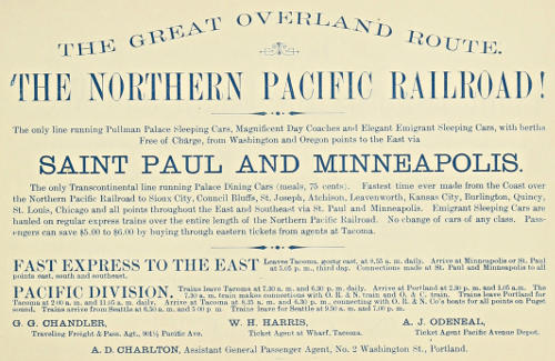 The only Transcontinental line running Palace Dining Cars (meals, 75 cents). Fastest time ever made from the Coast over the Northern Pacific Railroad to Sioux City, Council Bluffs, St. Joseph, Atchison, Leavenworth, Kansas City, Burlington, Quincy, St. Louis, Chicago and all points throughout the East and Southeast via St. Paul and Minneapolis. Emigrant Sleeping Cars are hauled on regular express trains over the entire length of The Northern Pacific Railroad. No change of cars of any class. Passengers can save $5.00 to $6.00 by buying through eastern tickets from agents at Tacoma.