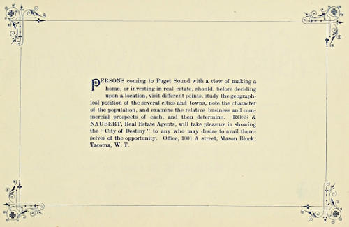 Persons coming to Puget Sound with a view of making a home, or investing in real estate, should, before deciding upon a location, visit different points, study the geographical position of the several cities and towns, note the character of the population, and examine the relative business and commercial prospects of each, and then determine. ROSS & NAUBERT, Real Estate Agents, will take pleasure in showing the “City of Destiny” to any who may desire to avail themselves of the opportunity. Office, 1001 A street, Mason Block, Tacoma, W. T.