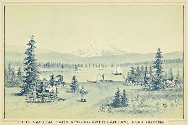 Parks are the adjuncts of cities of more mature years than this young giant of Puget sound, but nature has provided here that which many other cities acquire only by the outlay of much money and labor through a series of years. Lying south of the city, and but a short distance beyond its present limits, is a beautiful, level, gravelly plain, studded with oak trees, in the midst of which are lakes of clear, sparkling water. American lake, shown in the engraving opposite, where it forms the foreground for a beautiful landscape, of which Mount Tacoma is the central figure, attracts hundreds of pleasure seekers. Its waters teem with trout, and its shining surface offers both the oarsman and the yachtsman an opportunity to indulge in their favorite amusement. The drive from the city to the park is one of keen enjoyment to one whose eye drinks in the beauties of nature, and who delights to fill his lungs with the pure air, fragrant with the odor of forest and mountain. Other drives, in and about the city, offer the visitor exhilarating pleasure and beautiful landscapes. Not the least of the enjoyments of the tourist temporarily sojourning in the city is the row or sail on the placid waters of the harbor, or the more exciting sport of trolling for salmon in the bay. As many as a dozen fine salmon, from five to fifteen pounds in weight, are often caught in a few hours in the early morning. A boat house stands at the water’s edge, where row and sail boats may be procured, and morning and evening and on moonlight nights at a late hour, these little craft dart over the bay with their loads of pleasure seekers.