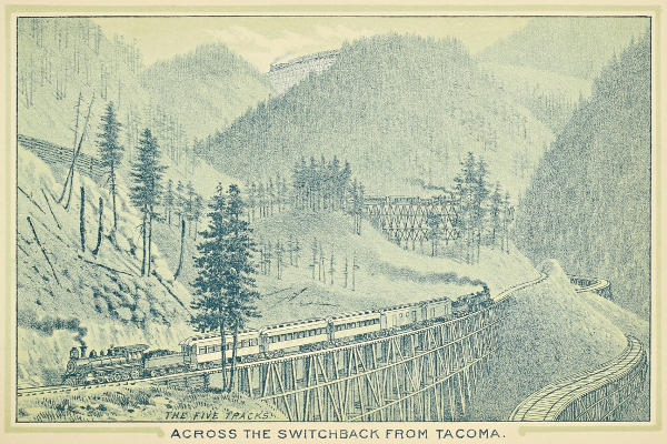 Desiring to open the Northern Pacific to travel and traffic a year earlier than was possible if they waited for the completion of the huge tunnel through the Cascades, a great passage blasted through the mountains ninety-eight hundred and fifty feet in length, the officers decided to construct a line over the summit on the “switchback” principle, at a cost of $300,000.00. It was completed early in the summer of 1887, having seven miles of track and an average grade of nearly three hundred feet to the mile. Huge decapod (ten drive wheels) locomotives were built for this service, the most powerful ever constructed. Two decapods are used, one at each end of the short train. The bottom line of the diagram represents the main track at the mouth of the tunnel. The train moves ahead until it passes the switch S, and then moves backward and upward until it passes the next switch, thus alternating until the summit is gained, when it descends on the opposite side in the same manner. The general principle of the “switchback” is clearly shown in the following diagram: