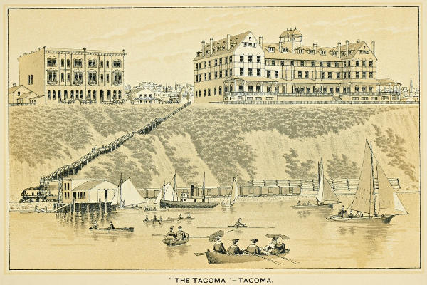 Tourists unhesitatingly declare that in this city they find the only really adequate and enjoyable hotel accommodations to be had on the Pacific coast north of San Francisco, and to this one fact is due much of the popularity of the city spread abroad by those who have enjoyed its hospitalities. Recognizing the necessity for such an institution, the Tacoma Land Company erected in 1884 the large and handsome stone and brick hotel building shown in the engraving on the opposite page. It stands on the bluff above the water front, overlooking the bay, river, valley, foothills and mountains. From the veranda and lawn a grand landscape may be seen, the great snowy mass of Mount Tacoma standing out in bold relief against the sky. The possession of such a house of entertainment, elegantly furnished and conducted in first class style by Mr. W. D. Tyler, a most courteous and able manager, renders the city a favorite summer resort and headquarters for those who desire to spend a few weeks viewing the grand scenery of the sound. On another page is given an engraving of the new and elegant Hotel Fife, a large five-story brick structure, recently completed at a cost of $125,000.00. It contains one hundred and twenty-six rooms, and is supplied with all the modern conveniences of gas, water, electric bells, elevator, etc. Hotel Fife is most elegantly furnished, and is conducted on the European plan. Hotel Rochester, recently erected on Tacoma avenue (see engraving on another page), is a large brick edifice, four stories high, and cost $75,000.00. It occupies a commanding site, and is designed for a family hotel, all its rooms being en suite, with bath, electric light and water. It is heated by steam, and has its own electric light plant, laundry and Turkish bath. A number of smaller hotels add to the city’s accommodations for strangers.
