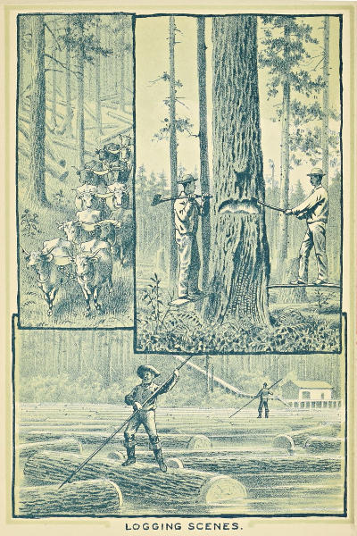 Puget sound holds a leading position in the United States in the magnitude of its logging operations. The quantity of logs put into the water in 1888 was four hundred and thirty-four million five hundred thousand feet. Logging is carried on to the best advantage in the summer time, and logging railroads, sometimes several miles in length, upon which locomotives draw cars of logs from the interior to the sound, or to streams connecting with it, have been built by a number of companies at great expense. In the huge size of the timber, the logger of the west finds an obstacle to contend with that the logger of the Michigan pineries does not encounter. Logs of six feet in diameter are frequent, while they occasionally much exceed that figure. Ox teams generally consist of six pairs of lusty animals, which are used to drag the logs to the railroad or stream. In cutting down this huge timber, the choppers use a novel device to avoid cutting through the swell near the ground. A notch several inches deep is cut in the side of the tree, and the end of a spring board, having an iron shoe, is put into the notch in such a way that it is bound fast by the weight of the chopper when he stands on it. If the first notch is not high enough, another is cut higher up. By this method the stumps left standing are from six to twelve feet high. When the tree is very large, two choppers work at a time, as shown in the engraving on the opposite page.