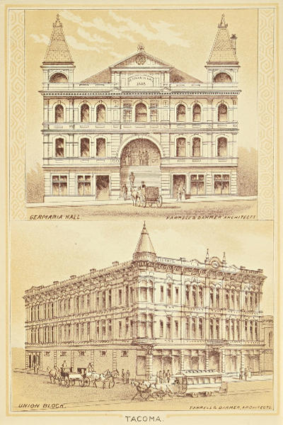Not the least of the marvels of Tacoma’s history is the great business blocks that have been erected, converting a forest wild into a city of brick and stone in less than a decade. A suggestion of the massive appearance of the buildings on a portion of one of the streets is given by the first engraving in this volume, while on other pages are presented engravings of a number of fine business blocks but recently erected. Here is located the only chamber of commerce building north of San Francisco. It is a substantial three-story stone and brick structure, and in addition to the board of trade rooms contains commodious offices and stores. Union block, on the corner of Eleventh street and Pacific avenue, is a three-story and basement brick structure, erected by Cogswell & Son and John S. Baker. It is one hundred by one hundred and twenty feet in size, contains large stores and office rooms and cost $55,000. Sprague Buildings is the title of a large brick block four stories high, and extending three hundred and eighteen feet on Pacific avenue, erected by Gen. J. W. Sprague. It cost $75,000.00, and contains four stores for wholesale business, each occupying four floors and basement. Germania hall is a frame structure sixty-six by one hundred and twenty feet in size, erected by the Germania Society, on E street, between thirteenth and fourteenth, at a cost of $10,000.00. It contains a large hall for amusements and meetings, with other rooms and basement. Ouimette block is a handsome three-story brick structure on Pacific avenue. Mason block stands on A street, one block from “The Tacoma,” and is a handsome three-story brick edifice, with St. Louis pressed brick front and Bellingham bay blue stone trimmings. It contains the post office, express office, a store and many elegant office rooms. The buildings specially mentioned are only those recently completed. Many other fine business structures adorn the business thoroughfares and testify to the prosperity and solid business interests of the city.