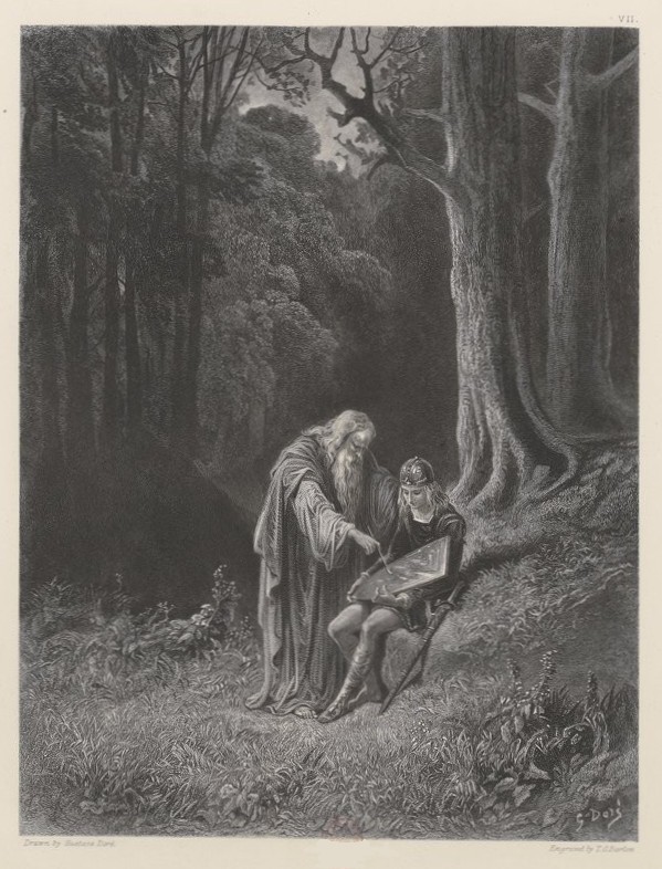 Merlin retirant sa main de celle de Viviane, dit: «Si sage que je sois, je ne fus jamais moins sage, trop curieuse Viviane qui parlez de confiance; je ne le fus jamais que lorsque pour la première fois j'ai fait mention d'un tel charme. Et même, puisque vous parlez de confiance, moi je vous dirai: j'ai été trop confiant lorsque je vous ai dit ces choses, et quand j'ai excité en vous ce vice qui a perdu l'homme par la femme dès les premiers temps du monde. Si une grande curiosité est louable chez les enfants, qui ont à connaître le monde et à se connaître eux-mêmes, en vous qui n'êtes pas un enfant (car lorsque j examine les traits de votre visage, je vois qu'il sait dissimuler) en vous je l'appelle... Non! je ne l'appellerai point vice; mais puisque vous vous comparez vous-même à une mouche d'été, je pourrais bien désirer une toile d'araignée qui s'établît en dépit de ses défaites jusqu'à ce que quelqu'un cède de guerre lasse; mais puisque je ne veux pas consentir à vous donner de puissance sur ma vie, mes actions, mon nom et ma bonne renommée, pourquoi ne demandez-vous jamais quelque autre grâce? Oui en vérité, par la croix divine, j'ai eu trop de confiance en vous.»