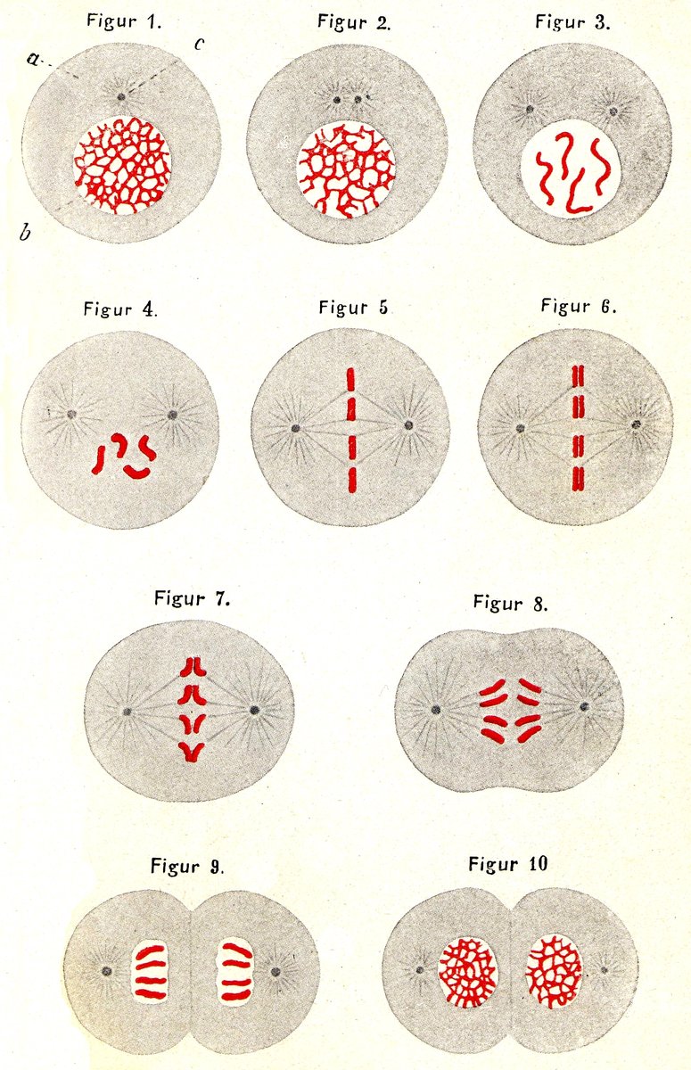 Für uns ist vor allem wichtig die Umwandlung des ruhenden Kernes in die Chromosomen, die Halbierung der Chromosomen und die sorgfältige Verteilung der Hälften auf die beiden Tochterzellen. Was durch den ganzen Vorgang erreicht wird, ist völlig klar: offenbar wird dadurch das Chromatin, die färbbare Substanz des Kernes, so gleichmäßig als irgend möglich auf die Tochterzellen verteilt. Offenbar ist diese gleichmäßige Verteilung des Chromatins Bedingung dafür, daß die Tochterzellen der Mutterzelle gleich werden.
