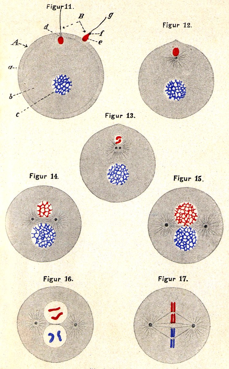 Nachdem der Kopf des Samenfadens vom Ei aufgenommen worden ist und die neugebildete Dotterhaut das Eindringen eines zweiten Samenfadens in das Innere des Eies unmöglich gemacht hat, sehen wir (s. Tafel 2, Fig. 11 bis 17), wie der Kopf des Spermatozoons sich allmählich dem Kerne der Eizelle nähert. Sein Kern nimmt= 15 = dabei an Größe zu und teilt sich dann in halb so viele Chromosomen, als den Kernen des Organismus, von dem der Samenfaden abstammt, sonst zukommen; beim Menschen also in 12. Die Chromosomen wachsen durch Fortsätze zu einem feinen Netzwerk aus. Zugleich scheidet sich aus dem Protoplasma der Eizelle Flüssigkeit aus, so daß der Kern des Spermatozoons nun genau wie das Kernbläschen einer ruhenden Zelle aussieht und dem Kerne der Eizelle zum Verwechseln ähnlich geworden ist. Es besteht kein Geschlechtsunterschied mehr zwischen den beiden Kernen. Auch ihre Größe ist in diesem Stadium vollkommen gleich. Während diese Veränderungen mit dem Kerne vorgehen, hat sich ein winziges Körperchen, das mit dem Kopfe des Spermatozoons in das Ei mit hereingebracht worden ist, mit einem Strahlenhofe umgeben und in zwei Körperchen geteilt. Jedes von diesen bekommt wieder einen Strahlenhof. Wir haben ohne Zweifel Gebilde vor uns, die genau den Zentralkörperchen oder Centrosomen der gewöhnlichen, in der Teilung begriffenen Zellen entsprechen. Während Eikern und Samenkern immer näher zusammenrücken, rücken die beiden Centrosomen auseinander. Die beiden Kerne fangen nun gleichzeitig an, Chromosomen zu bilden; der Kern des Eies genau so viele wie der Kern des Samenkörperchens, also ebenfalls nur halb so viele, als die Kerne der betreffenden Tierart sonst bilden. Diese Chromosomen ordnen sich in einer Ebene zusammen und teilen sich der Länge nach. Ihre Hälften werden durch die Fäden, die von den Centrosomen ausgegangen sind, auseinander- und gegen die Pole hingezogen; kurz, alles weitere verläuft genau so wie mit dem einen Kerne einer gewöhnlichen Zelle, die sich in indirekter Zellteilung befindet. Der einzige wahrnehmbare Unterschied ist nur der, daß die Hälfte der Chromosomen vom Eikern, die andere Hälfte vom Samenkern herrührt, und daß= 16 = jedem Pole angenähert die Hälfte der väterlichen und der mütterlichen Kernsubstanz zugeführt wird, also jede der beiden Tochterzellen einen Kern bekommt, der zur Hälfte vom Vater, zur Hälfte von der Mutter abstammt. Da der Spermakern wie der Eikern halb so viele Chromosomen bildet als die Kerne der Körperzellen, so liefern beide zusammen ebensoviel Chromatin und Chromosomen, wie in einer normalen Zelle vorhanden ist, und jede der beiden Tochterzellen bekommt daher ebenfalls die normale Menge davon.